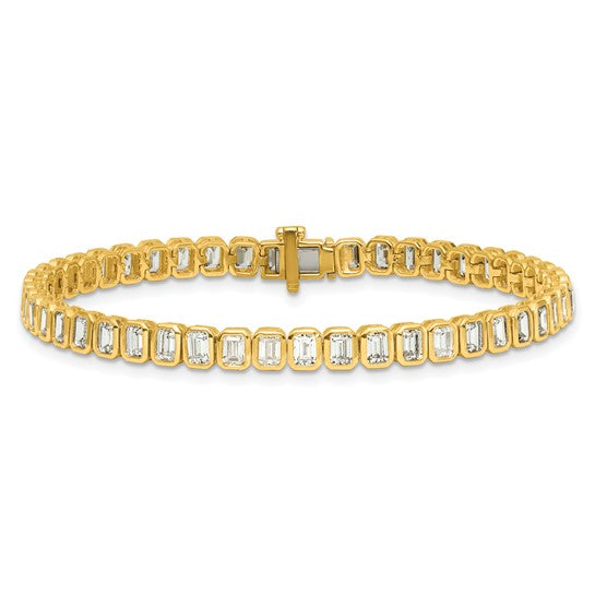 This tennis bracelet showcases 6 ½ carats of lab grown emerald-cut diamonds, each secured in a sleek 14K gold bezel setting.