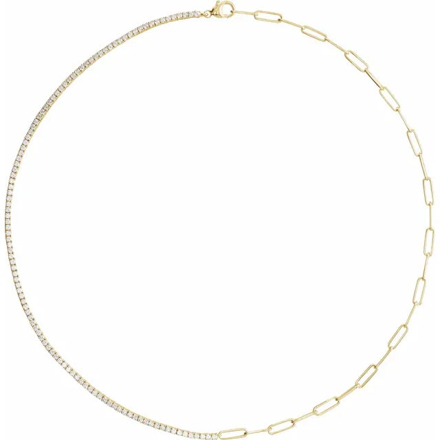 Elevate your jewellery collection with this stunning 3 1/4 carat lab-grown diamond paper-clip necklace crafted in solid 14K gold. Featuring a sleek paper-clip link design accented with brilliant lab-grown diamonds, this modern yet timeless piece adds effortless sparkle to any outfit. Perfect for layering or wearing solo, it’s an elegant choice for both everyday luxury and special occasions.