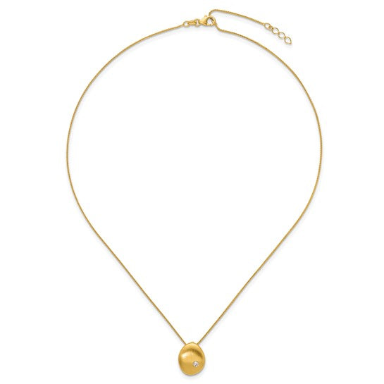 14K yellow gold, the pendant features a soft satin finish that enhances its natural warmth, accented by a sparkling diamond at its center for a refined touch of brilliance. The necklace measures 16.5 inches with a 2-inch extender, allowing you to adjust the length for versatile layering or perfect placement with any neckline. Ideal for both casual and formal looks.